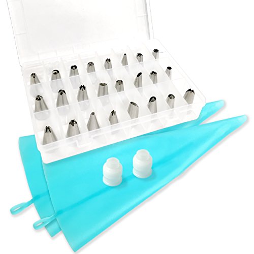 Cake Decorating Supplies - 24 Stainless Steel Tips Set, 2 Reusable Plastic Couplers and 2 Large Reusable Silicone Bags, for Creating Many Different Kinds of Decorations