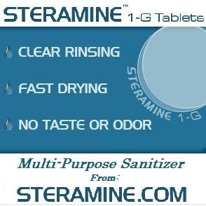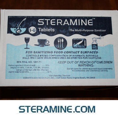 STERAMINE 1-G Sanitizing Tablets - 150 Tabs per bottle Makes 150 gallons of cleaning solution - Used by Restaurants & Bars Worldwide! Commercial strength but also makes a great economical household sanitizer! One bottle makes 150 gallons of Quaternary solution! Just 1 tablet per gallon of water! Odor Free, Non corrosive, does not irritate the skin ! May also be applied with a clean cloth or sponge. Works great in Kitchens & Bathrooms! Can be sprayed on Food processing equipment, sinks, countertops, cabinets, refrigerators, stovetops, cutting boards, and all other non-porous articles and surfaces.Feature