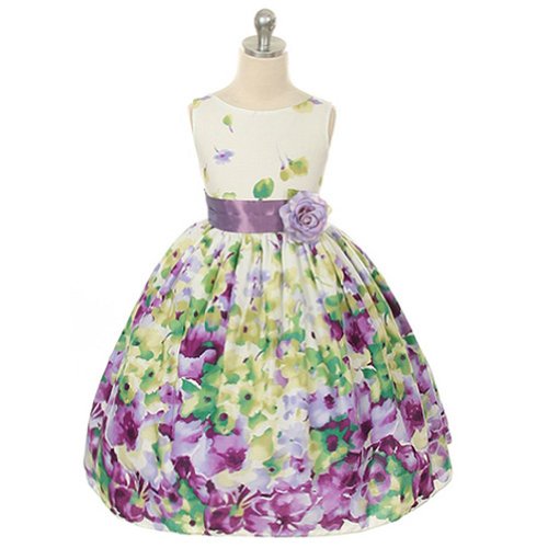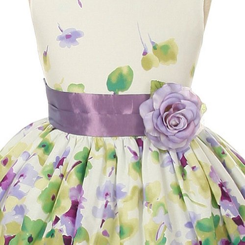 Spring/Summer below-the-knee length girls dress has a sleeveless fitted bodice has a zipper back and a matching attached satin sash waistband that ties in a bow at the back. Removable flower. Floral print fabric overlays lining with tulle trim for a soft full look. Available in Fuchsia or Lavender Floral pattern. Hand wash. Made in the USA. Flower color may vary.Feature