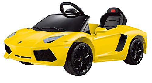 -. Binding : Toy -. Brand : RASTAR -. Color : yellow -. EAN : 0853451006035 -. Feature : Can be controlled by your child via steering wheel and pedal or by parent with the included remote controller / Functioning front lights, horn and seat belt / Perfect For 2-4 Years Of Age with a weight capacity of 55 lbs / Realistic engine noise & start-up sounds in addition to MP3 connectivity for playing their favorite tunes -. IsAdultProduct : 0 -. Label : Rastar -. Manufacturer : Rastar -. PackageQuantity : 1 -. ProductGroup : Toy -. ProductTypeName : TOYS_AND_GAMES -. Publisher : Rastar -. Studio : Rastar -. Title : Lamborghini Aventador 6V Ride On Kids Battery Powered Wheels Car RC Remote. -. UPC : 853451006035