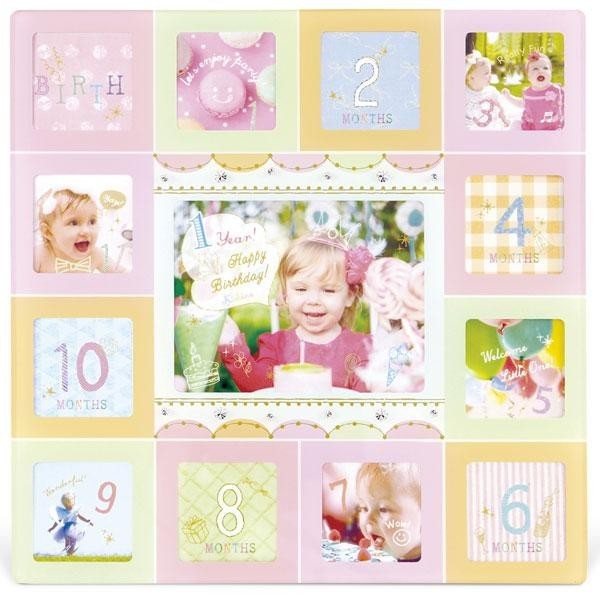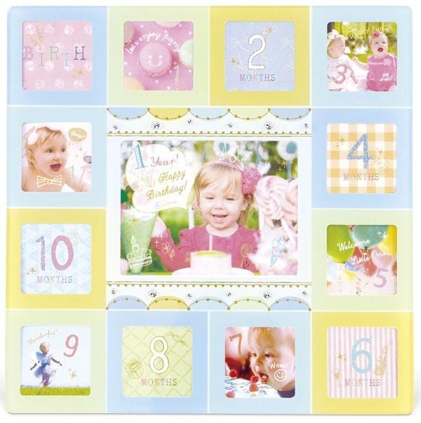 誕生から毎月1枚ずつ、1歳のお誕生日を迎えるまでの13枚の写真を飾ることができるフォトフレームです。カラフルでハッピーな雰囲気に加えて、飽きのこないベーシックなデザインは子供部屋にもぴったり☆色とりどりのガラスやキラキラと輝くラインストーンが、赤ちゃんの表情をより楽しく彩ります。 |