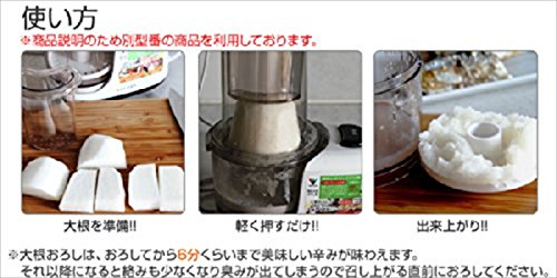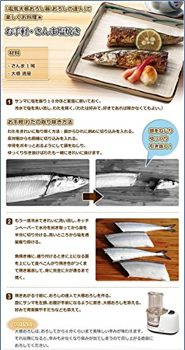 ●전원:AC100V(50/60Hz)●소비전력:80W●정격시간:3분(3분간 사용,20분간 이상 중지)●내려 시간:(무우 약100g)약10초,(사과 약250g)약25초●코드장:1.2m●용기 용량:350ml●최대 조리 용량:250g(무우 사과를 지정크기로 컷 한 것)●안전장치:안전 스위치(상뚜껑이 완전히 꼭 닫혀 있지 않은 상태에서는 전원이 들어 가지 않는다)●힘 있지 않고 편안히 무우 내리기●산마 등 생선구이에 첨부하거나,그러면 청하 # 물건(물품,품질) 어느 무쳐 것에●문질러 내려 사과도 가능●섬유와 내리기즙을 나눌 수 있는(국)즙잘라 플레이트부●스테인레스제 내려 커터