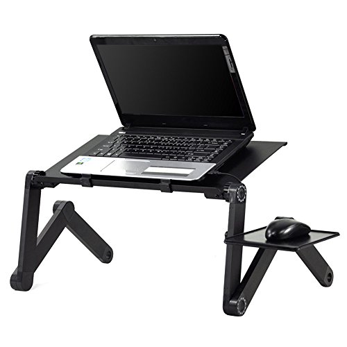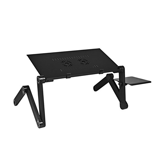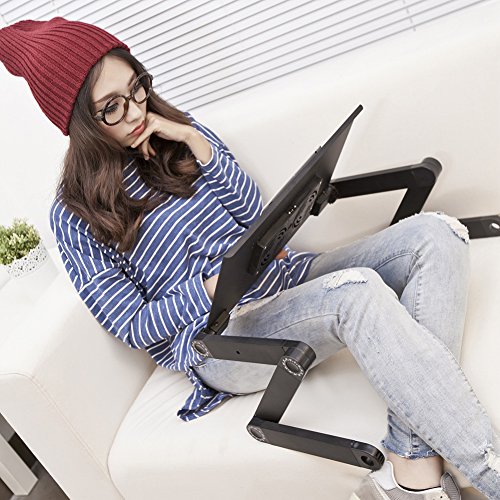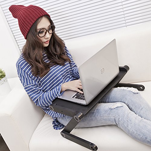 -. Feature : ADJUSTABLE DESIGN: Each folding leg has 3 knobs which can adjust any height and angle you need. The 360°revolve provides the high flexibility just as human. / MULTIFUNCTION: Ergonomic sleek design with multi-functional concept ,laptop coputer desk,also could be used for eating food, coloring, reading, doing homework on the bed, sofa, recliner, floor, car, etc. / HEAT DISSIPATION FUNCTION:Beautiful hollowed out swirl-shaped cooling pad designed desktop for better heat dissipating. / PORTABLE LAPTOP DESK :You can work anywhere, simply fold the desk and you have your own ergonomic workstation ready. / EASY TO USE:360 SP.R.Ing Lock Button Joints on Each Side to Adapt to any Positions.Two auto-lock buttons on each side easily enable quick changes in height, in addition two clamps could be used to adjust the surface angle (15°).