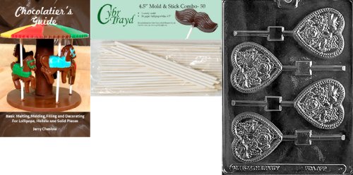 Cybrtrayd 'Wedding Heart with Doves Lolly' Wedding Chocolate Candy Mold with 50 4.5-Inch Lollipop Sticks and Chocolatier's Guide