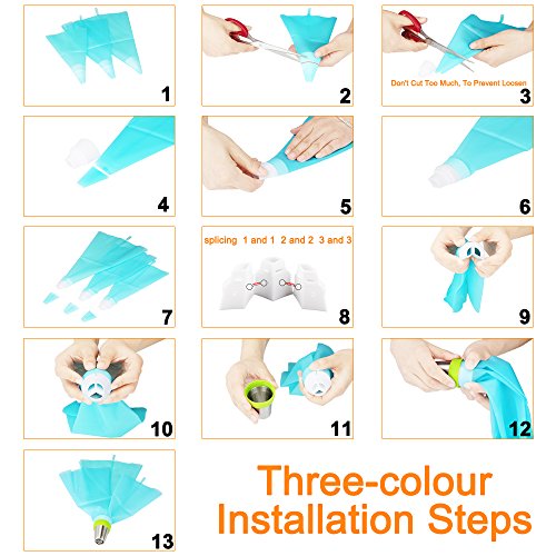 - 3 PIECES TRI COLOR COUPLERS + 3 SIZE REUSABLE SILICONE PASTRY BAGS: The tri-color couplers and decorating bags are free, food grade plastic tri color couplers, you can safely use it. 3 different size of reusable decorating bags. Lagre Size: 15.94 inch, Medium Size: 11.81 inch, Small Size: 10.43 inch. The bags can be folded, not easy to damage and deformation, easy to wash (Don't cut pastry bags too much, to prevent loosen).