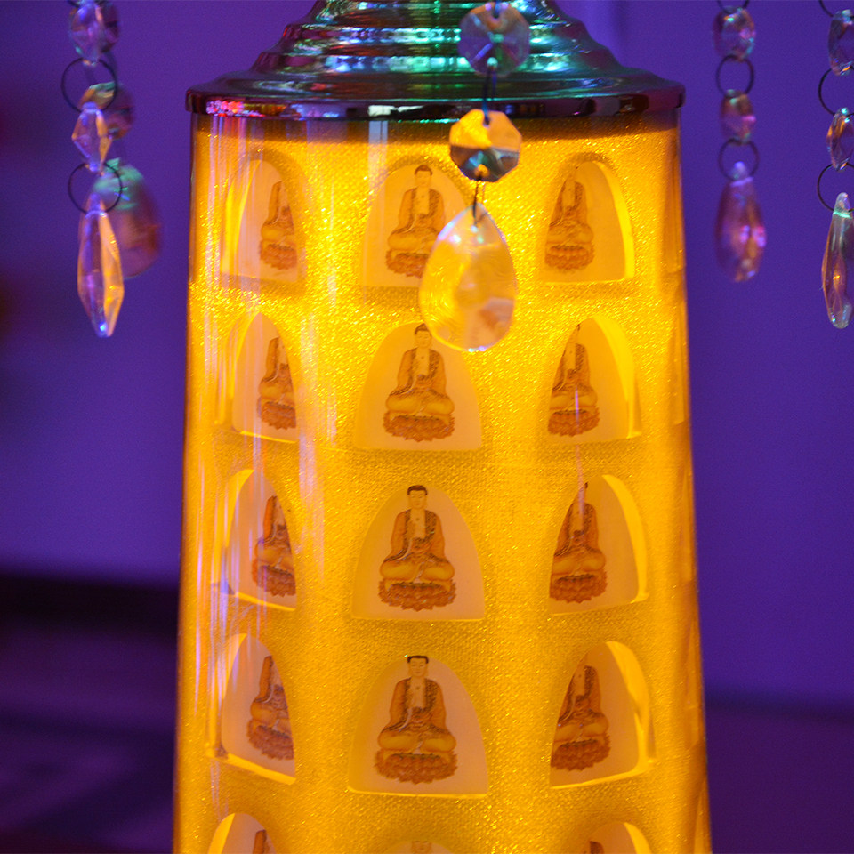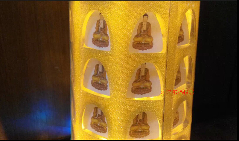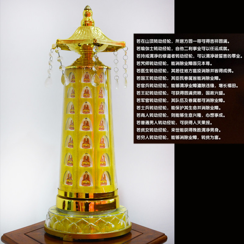 商品特性:念佛机和转经轮的结合。电动驱动,通电后转经轮开始徐徐转动,并开始播放佛音(声音可调大小,当夜色降临时,可以调歌曲调为静音),只要按一下选曲按钮,就可换下一首,