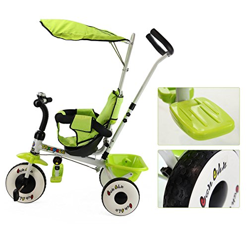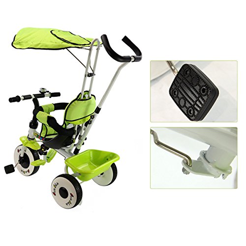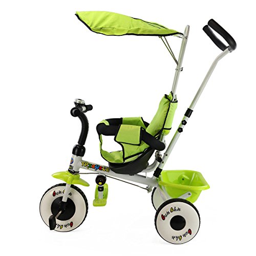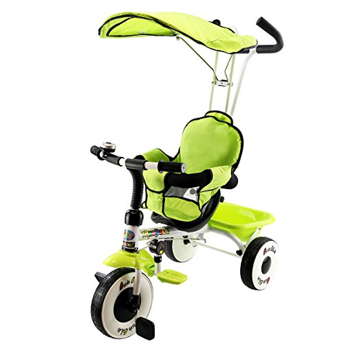 Studio : MTN Gearsmith Publisher : MTN Gearsmith Product Description Description This is our new ultimate 4-in-1 tricycle. The perfect Fit 4-in-1 trike is ready to grow with your child! With all of the features of your favorite stroller, this trike is not only a perfect fit for your child but also a "perfect fit" for parents too! The removable shade canopy will protect your child from the elements, while you can check on her with the canopy's peek-a-boo flap. Carry snacks and toys in the handy rear cargo basket. When he is ready to pedal the trike, the foot rest is easily raised or lowered out of the way. Simply remove the height-adjustable handle when the child is all set to ride solo. The trike has quiet ride tires when pedaling. Competitive Price With High Quality Can Be Realized Here. Welcome! Feature Brand new and high quality. Can be assembles in 4 ways according to your kid's age Removable canopy for UV protection High-back seat for comfort and safety removable wrap around safety bars Multi Adjustable Push handle can control tricycle movement Front and Back Foldable Footrest, Pedals become footrests for early stages Back storage basket Includes bell Specifications Color: Green, Red Material: iron and PP plastic (frame), rubber(wheels), 600D oxford cloth(shade canopy), EVA sponge(protect bar and holder) Overall Dimension: 33' x 19' x 39' Product Weight: 18lbs weight Capacity: 55lbs Suitable age:1-4 years old Package included: 1 x children tricycle, 1 x installation manual 0
