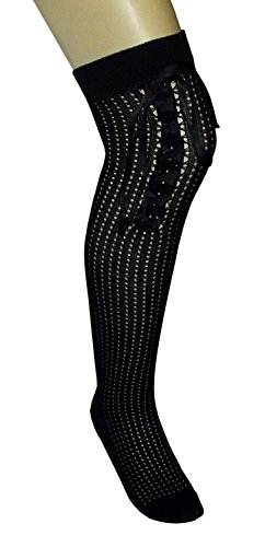 K. Bell Pointelle Over The Knee With Front Lace Up Satin Ribbon Women's Socks-Black