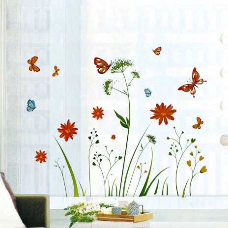 -. Title : Dnven (43"w X 28"h) Fresh Floral Grasses Blossoms Flowers with Butterlies Baseboard Stripe Border Wall Decals, Bedrooms Living Rooms Office Decals Removable Wall Stickers Murals