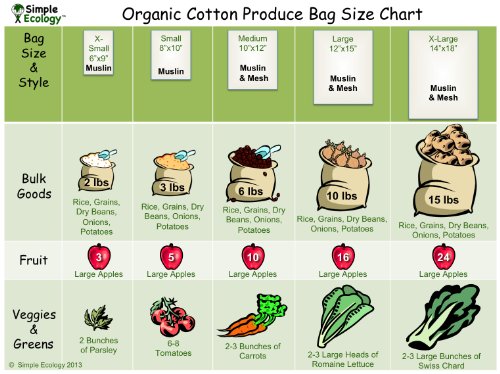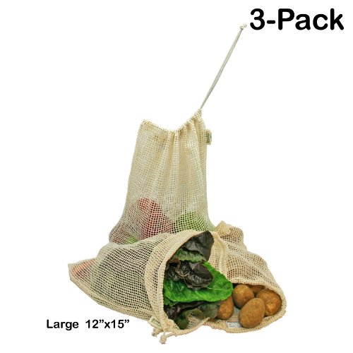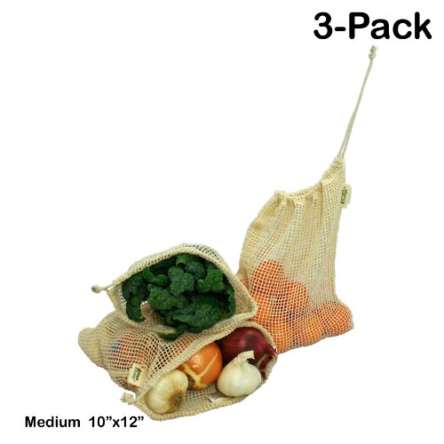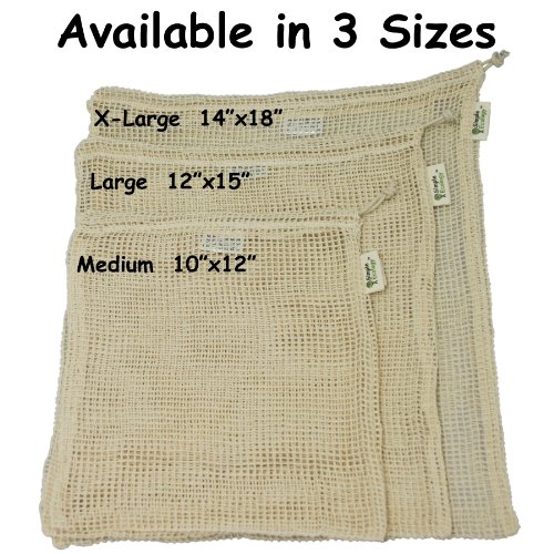 Trips to the market can easily require 6 to 8 plastic produce bags. Our reusable Mesh Produce Bags eliminate the need for all of that plastic. The 1/8-inch square mesh fabric is highly stretchable and allows for easy identification of contents. It provides excellent air circulation, great for pantry storage of thick-skinned produce like potatoes and onions. You can hang full bags on hooks by the drawstring for extra pantry space. Mesh bags work well for refrigerator storage of produce like apples, oranges and cucumbers. Refrigerators dehumidify the air to prevent frost buildup, so we do not recommended storage of delicate produce that easily wilts, like lettuce and greens, in a mesh bag. Consider our Organic Cotton Muslin Produce Bags for that task. Mesh bags are easy to care for, just wash in cold water, smooth out wrinkles and line or flat dry. While you can expect about 10% shrinkage on the first wash, the mesh material will stretch out to nearly the prewashed size when filled again. These bags are made of UNBLEACHED ORGANIC COTTON, which provides huge benefits to the environment and our health by avoiding the highly toxic pesticides, fertilizers and processing chemicals used in regular cotton crops.