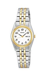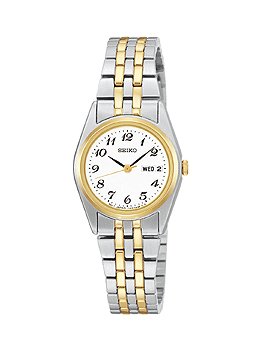Classic styling with elegant detailing, the Seiko Women's Functional Two-Tone Stainless Steel Watch features a two-tone stainless steel case and band. For added style, this timepiece comes with polished black Arabic hour markers and hands, and a gold-tone crown. The watch's attractive white dial features a date window at the three o'clock position and comes protected by a scratch-resistant Hardlex crystal. Other features include a band that closes with a deployment buckle, reliable Japanese quartz movement, and water resistance to 99 feet (30 meters).Feature