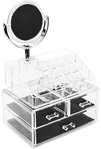 - DURABLE & LONG-LASTING — Made of acrylic (durable clear plastic) — Includes 1 large drawers, 2 small drawers, 16 slot compartments, mirror, and mesh padding inserts — Drawers slide open smoothly and handles are easy to grip — Can be used alone or to complement any acrylic organizers sets by Sorbus — Makeup NOT included — Measures approximately 9.25” L x 6.25” W x 14.75” H (without mirror height is 8”)