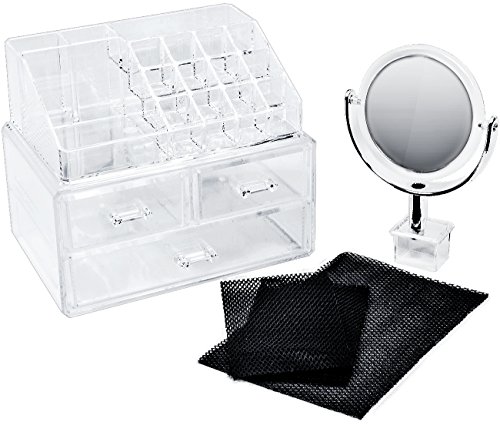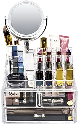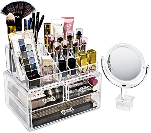 - STYLISH WITH REMOVABLE MIRROR — Chic and elegant exterior — Clear acrylic creates a visually appealing display that coordinates with any style or existing décor —Detachable two-sided circular mirror has great magnification for makeup application, tweezing, and other grooming tasks requiring a close view— Great gift for any girl, teen, adult, beauty, fashion, and makeup lover