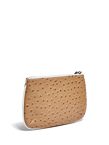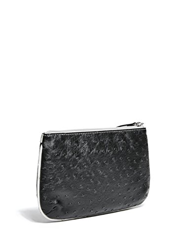 -. Feature : Ostrich-textured faux-leather exterior with contrast trim. Silver-tone hardware. / Front logo plaque. Top zipper closure. / Interior features zipper pocket / Wristlet strap with 6" length / Fabric lining