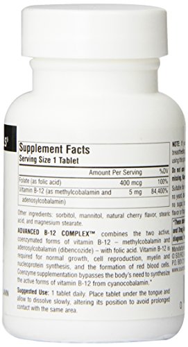 Dietary supplement. Advanced B-12 Complex combines the two active, coenzymated forms of vitamin B-12 - methylcobalamin and adenosylcobalamin (dibencozide) - with folic acid. Vitamin B-12 is required for normal growth, cell reproduction, myelin and nucleoprotein synthesis, and the formation of red blood cells. Coenzyme supplementation bypasses the body's need to synthesize the active forms of vitamin B-12 from cyanocobalamin. (These statements have not been evaluated by the Food and Drug Administration. This product is not intended to diagnose, treat, cure or prevent any disease.) Suitable for vegetarians. Contains no yeast, dairy, egg, gluten, soy, or wheat. Contains no sugar, starch, salt, preservatives or artificial color, flavor or fragrance.Feature