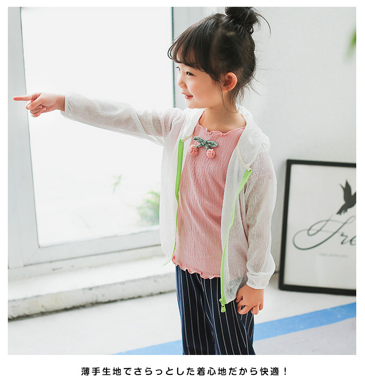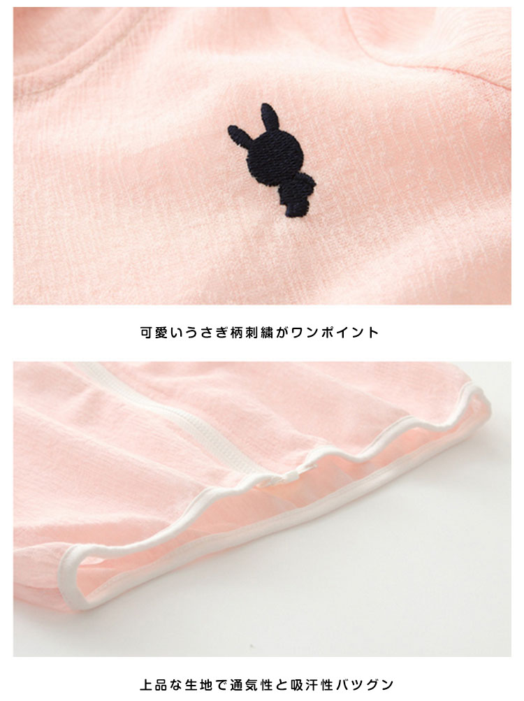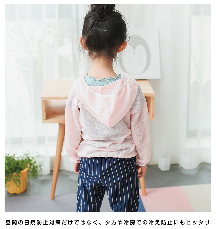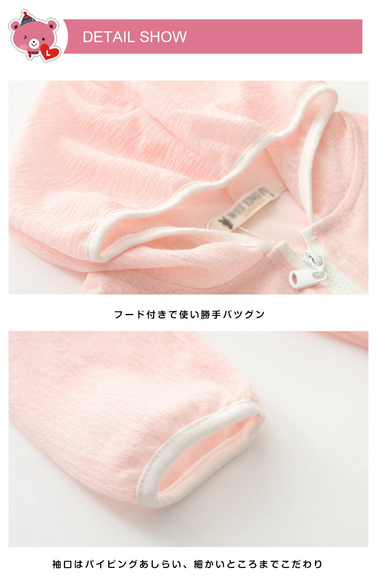 | 胸もと刺繍を添えて、可愛いフード付きパーカー柔らかい肌触りがお子様にも安心◎昼間の日焼防止対策だけではなく、夕方や冷房での冷え防止にもピッタリ薄手生地でさらっとした着心地だから快適!ジップアップタイプで小さい子供も簡単に履き脱ぎできるからママも安心 | |