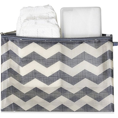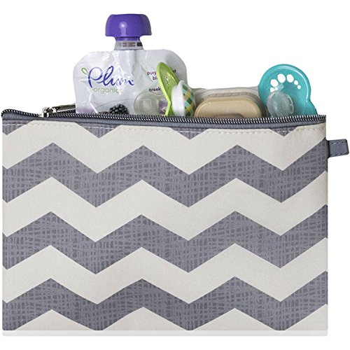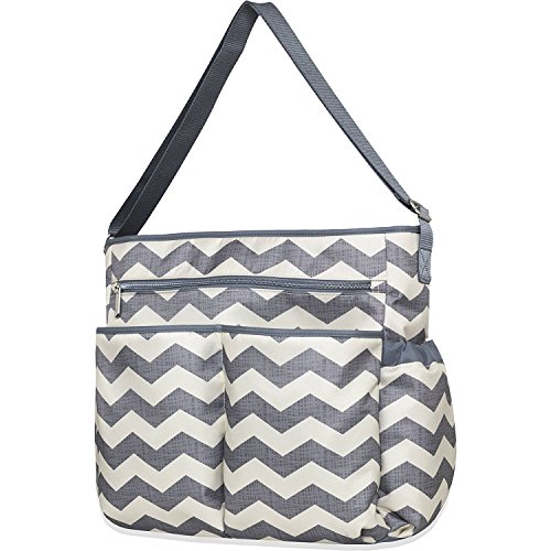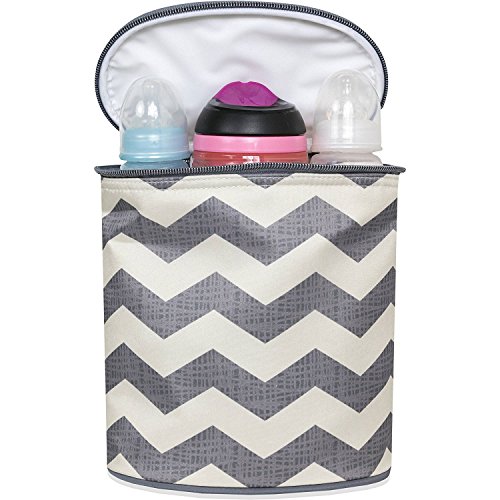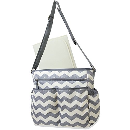 Organization doesn't have to take a backseat to fashion. The Urban-Dash Diaper Bag has a chic downtown vibe in a cream and grey chevron print and offers so many smart solutions to keep all baby's must haves right where you can find them. Count on three zip pouches to safely stash it all, an insulated bottle bag to keep food and drink cool, a large zip front pocket to hold a day's worth of diapers, a diaper clutch, a matching, chevron printed wipe case and a coordinated changer. The zip top gives you easy access and the cream colored lining makes items inside easy to find. Trim is grey with silver-tone zips and pulls. Lining easily wipes clean, and the grey shoulder strap is adjustable, and can be worn cross-body for hands free convenience. Own your confidence, you and baby are ready for everything.Feature