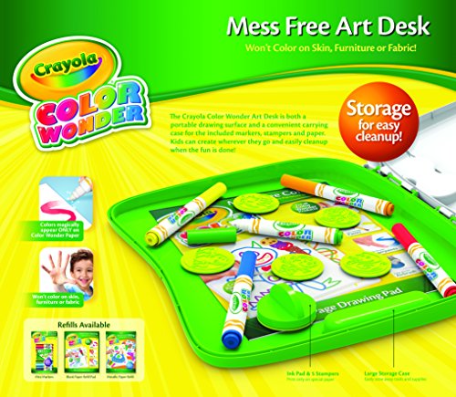 The Crayola color wonder art desk is both a portable drawing surface and a convenient carrying case for your color wonder supplies. Kids can create wherever they go and easily cleanup when the fun is done! includes 15 pages blank color wonder paper and 5 markers, non-drying mess-free ink pad and 5 jungle themed stamps.Feature