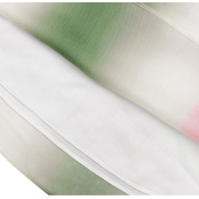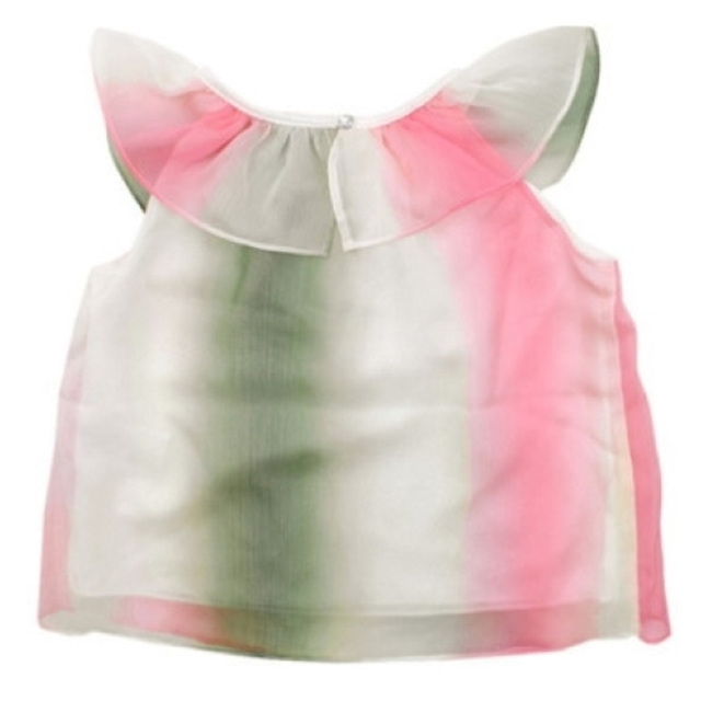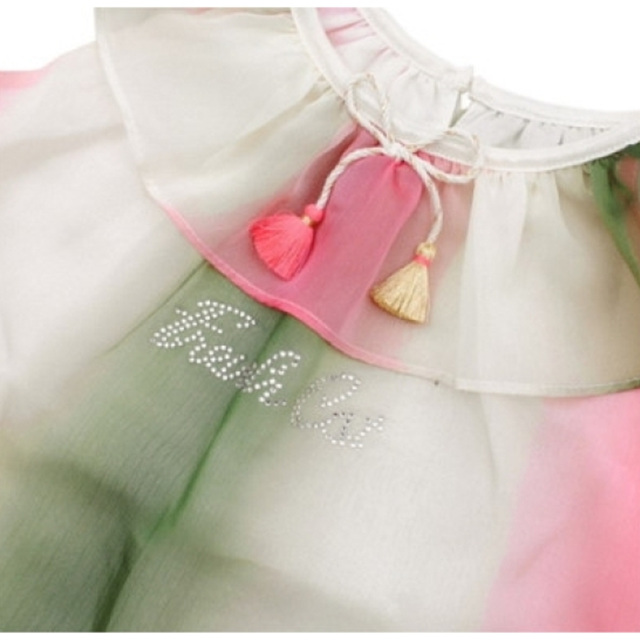 시원한 조직감이 있는 쉬폰 소재에 카키와 핑크 그라데이션 나염을 찍어서 고급스러운 느낌을 주는 민소매 탑 제품입니다. 블라우스 느낌으로 민소매이지만 목프릴을 길게 해주어 어깨까지 덮어 편안하게 코디할 수 있는 탑으로 형광 핑크 컬러와 골드 컬러가 믹스된 태슬 리본이 귀여운 포인트가 되어 줍니다.