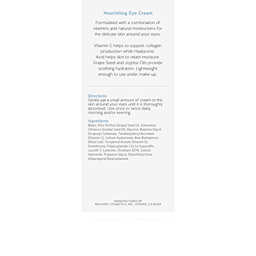 Formulated with a combination of vitamins and natural moisturizers for the delicate skin around your eyes. Vitamin C helps to support collagen production while Hyaluronic Acid helps skin to retain posture. Grape Seed and Jojoba Oils provide soothing hydration. Lightweight enough to use under make-up.Feature
