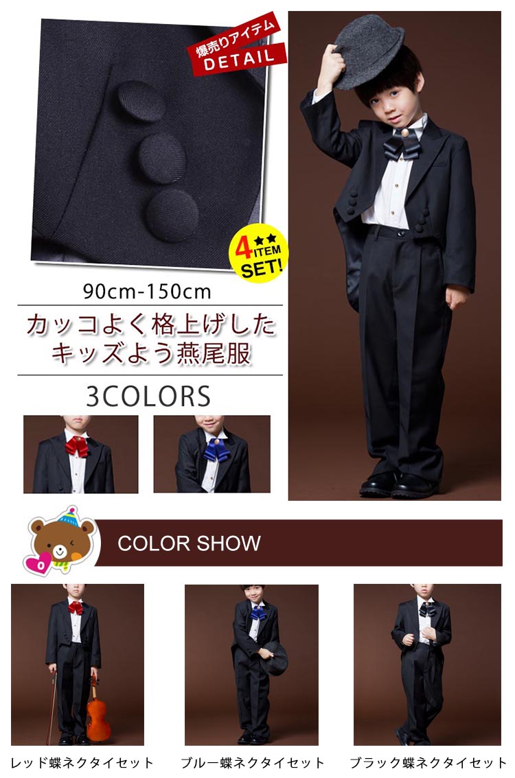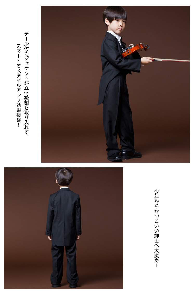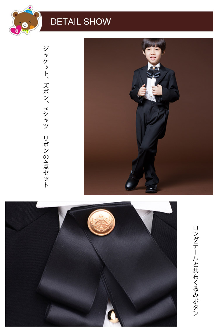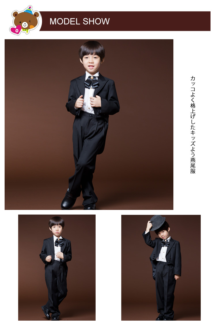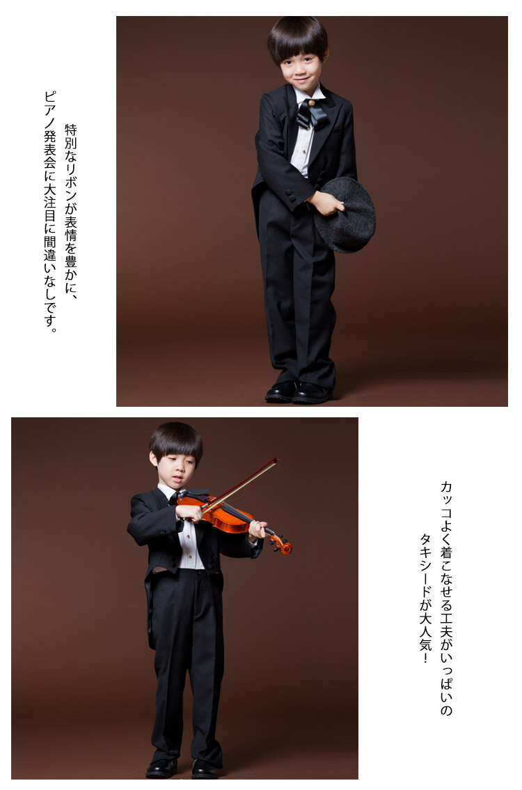 | カッコよく格上げしたキッズよう燕尾服特別なリボンが表情を豊かに、ピアノ発表会に大注目に間違いなしです。カッコよく着こなせる工夫がいっぱいのタキシードが大人気!テール付きジャケットが立体縫製を取り入れて、スマートでスタイルアップ効果抜群!少年からかっこいい紳士へ大変身! | |
