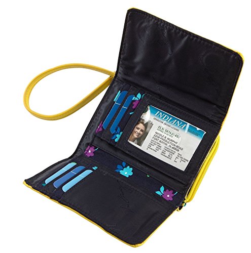 -. Binding : Apparel -. Brand : Vera Bradley -. Color : Midnight Blues -. Department : womens -. EAN : 0886003186022 -. Feature : Pockets aplenty, ID window, card slots / Slip pocket for cash and an outer zip pocket for your phone or coins / All in a sweet little package trimmed in rich leather / 5 ½" x 3 ¾" with 6" wrist strap -. MPN : 12615136 -. PartNumber : 12615136 -. ProductGroup : Shoes -. ProductTypeName : ACCESSORY -. Title : Vera Bradley Anniversary Wristlet in Midnight Blues and Yellow Leather -. UPC : 886003186022