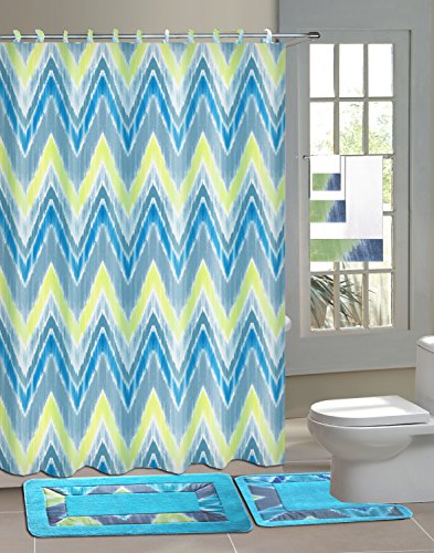 -. Title : Cynthia Blue & Lime Green 15-Piece Bathroom Accessory Set: 2 Bath Mats, Shower Curtain & 12 Fabric Covered Rings