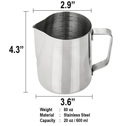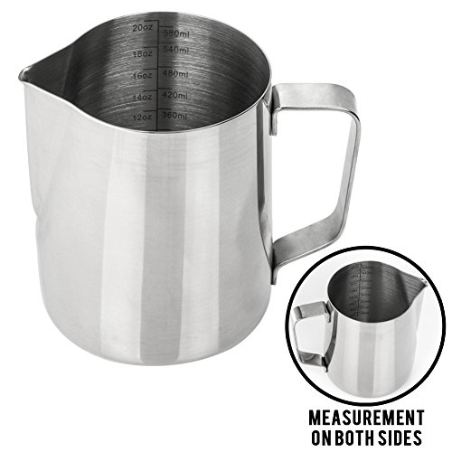 EXCLUSIVE 20 OZ FROTHING PITCHER WITH MEASUREMENT MARKS – Inside this frothing pitcher there are measurement marks in ml and oz scale on both sides. Measuring beverages is easier now!