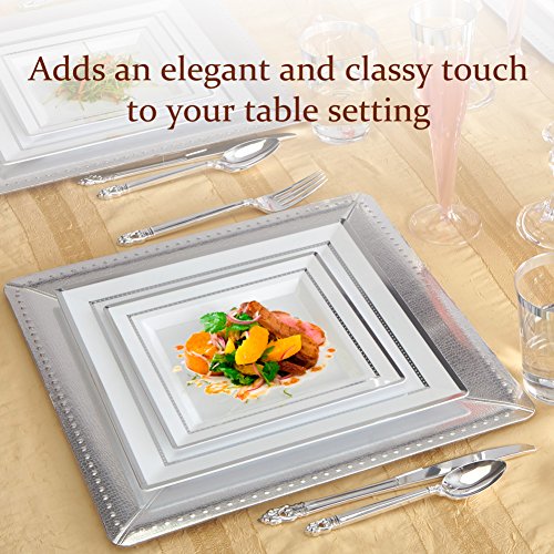 Set your table to perfection with our Metallic Silver 13” Disposable Chargers. With its fine look and elegant contrasting design these chargers are sure to bring your event to the next level. 0