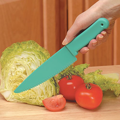 Safe Edge Lettuce Knife. No Oxidation. Serrated angled long plastic blade keeps Lettuce leaves green and appetizing. Safe on nonstick cookware for cutting brownies and cakes, too. Dishwasher Safe. 11" Long.
