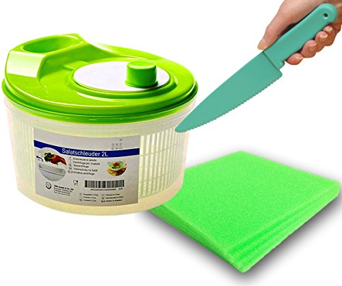 Salad Spinner Bundled with Lettuce Knife and 4 Produce Saver Foam Refrigerator Bin Liners. 2-Quarts Salad Spinner with Colander, Dishwasher Safe, BPA Free. Safe-Edge Lettuce Knife. 4 Fridge Bin Liners