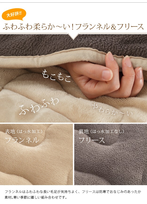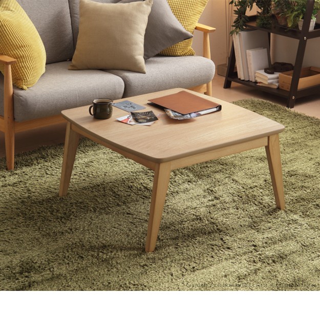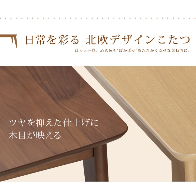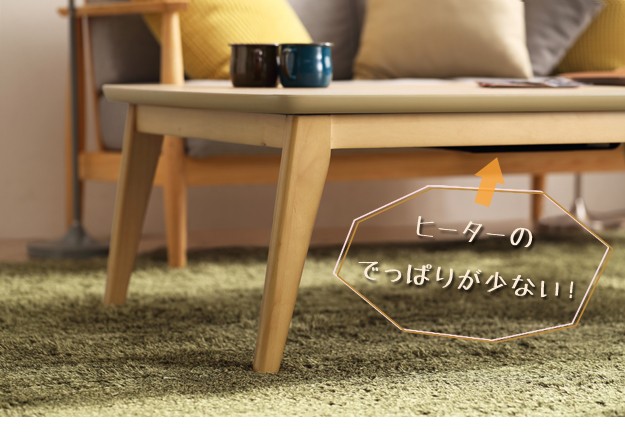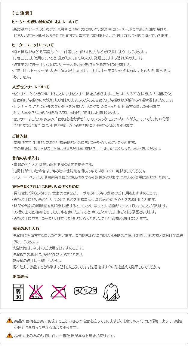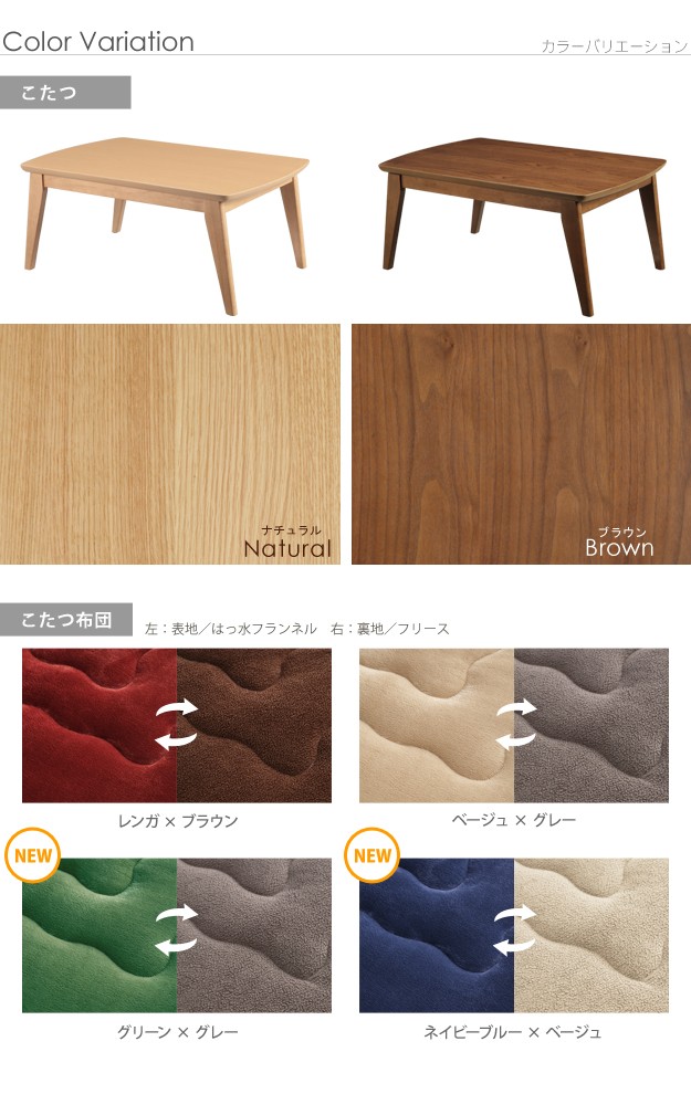 材質:こたつ天板-天然木化粧繊維板(ブラウン/ウォールナット・ナチュラル/楢)・ウレタン塗装、こたつ幕板・脚部-天然木(ラバーウッド)・ウレタン塗装、布団表地-ポリエステル100%(撥水フランネル)、布団コーナー・裏地-ポリエステル100%(フリース)、中綿-ポリエステル100%