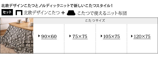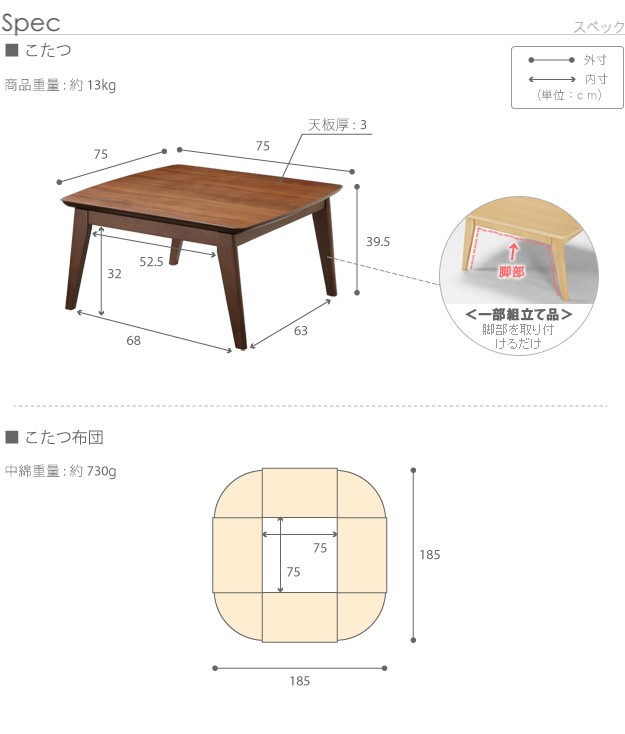 サイズ:こたつ-幅75x奥行75x高さ39.5cm・約13kg、布団-185x185cm・中綿量730g