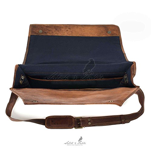-. Binding : Electronics -. Brand : Satch&Fable -. EAN : 0705332894890 -. Feature : 17"(w)x12"(h)x4"(d) Shoulder strap, Solid brass fittings that will not rust tarnish or leave black marks / Three internal compartments one padded, Two zippered pockets, / Strong lightweight Morocco leather (naturally waterproof goatskin) / Natural tanning process without the use of chemicals or dyes, / Tawny color that grows richer and darker with use, Lining: durable blue canvas -. Label : Satch&Fable -. Manufacturer : Satch&Fable -. ProductGroup : PC Accessory -. ProductTypeName : CARRYING_CASE_OR_BAG -. Publisher : Satch&Fable -. Studio : Satch&Fable -. Title : Handmade Leather Laptop Flap Bag 17" -. UPC : 705332894890