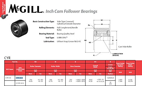 McGill CYR3/4S Cam Yoke Roller, Sealed, Inch, Steel, 3/4" Roller Diameter, 1/2" Roller Width, 1/4" Inner Diameter, 9/16" Overall Width, 0.61" Endplate Diameter