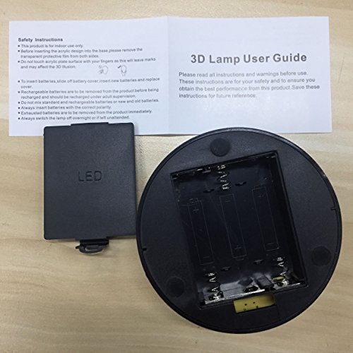 -. Feature : Material--Acrylic Panel+ABS Base. / 3D light hologram--The 3d optical illusion lamp uses a 2D flat construction that transforms into an illuminated 3D object,create a 3D effect. / Durable&Energy Saving--Power spend:0.012kw.h/24 hours.LED life span:10000hours. / Smart touch control colors--7colors can be changed flexible to red, green, blue, yellow, cyan, purple, white. / Customize--You can create an unique 3D light, just please contact us and provide the images with white background.This Personalized service is FREE!
