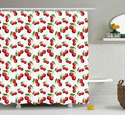 Kitchen Shower Curtain by Ambesonne, Cherry Pattern Design Fresh Berry Fruit Summer Garden Macro Digital Print, Fabric Bathroom Decor Set with Hooks, 70 Inches, Red Green and White