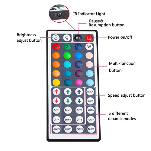 All in one kit: Comes with flexible LED strip light, 44 key remote controller, 12V/5A power supply, IR control box and connectors. No more accessories are required.