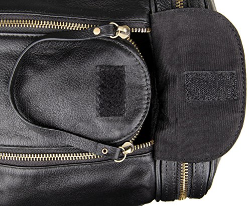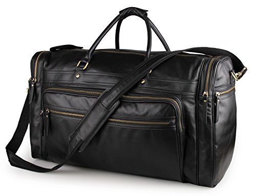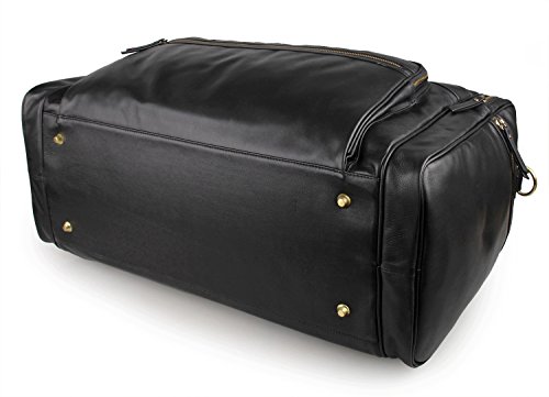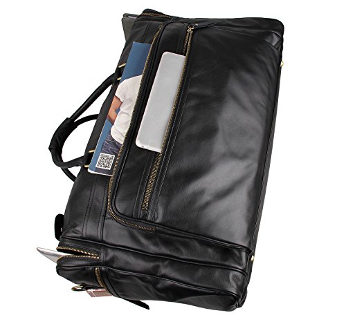 -. Feature : Dimensions: 23"L x 9.5"W x14 "H. Genuine leather duffel bag for 2-5 nights business trip; / Joining hook-and-loop top handles; Removable & adjustable shoulder strap with comfortable shoulder pad / Inside laptop compartment can hold 17" laptop, smart contrast stitching and canvas lining; / 4 metal brass feet on the bottom for protection;Premium Leather Duffel for Air Travel, Business Trips, Weekend Getaways etc / Spacious Compartment to Carry Clothes, iPad, Magazines, Books, Travel Items, etc.