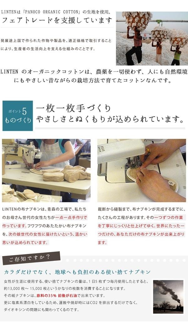 | 「Linten」は『布ナプキンの良さをそのままに紙ナプキンと同じ安心感』を実現したいという思いから機能性を探求。初めて布ナプキンをご使用される方でも、安心してご使用いただけるように、中地に吸水・撥水のW加工を施してあります。冷え取り素材としても人気のシルクのおりもの用ライナーとセットにしました。中地には布ナプキンと同じパイルも入れているので、オリモノが多い日や、生理の終わりかけにもご利用いただけます。 |
