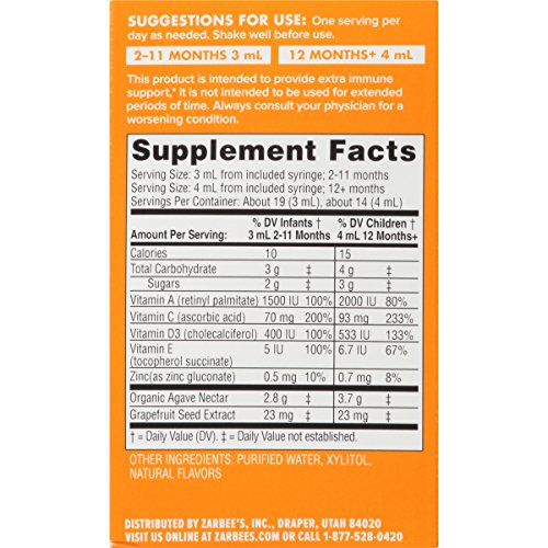 Zarbee's Naturals Baby Immune Support & Vitamins Supplement is specifically designed to meet the needs of growing babies and toddlers. Safe for babies as young as two months, this vitamin supplement is an excellent source of vitamins plus zinc to help support a strong immune system when they need it most.* Made with wholesome and simple ingredients, this vitamin supplement has a naturally sweet agave syrup base and a yummy natural orange flavor with no unpleasant medicinal taste. Founded by a pediatrician and father looking for a healthy and chemical-free alternative for his family, Zarbee's Naturals Baby Immune Support & Vitamins Supplement is made with carefully-sourced, wholesome ingredients and without drugs, alcohol, gluten, artificial dyes, flavors, sweeteners, or preservatives.Feature