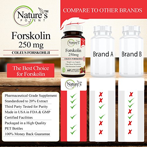 -. Feature : Weight Loss Support / Helps Boost Metabolism / Non-Stimulant Formula / Pharmaceutical Grade - Nature's Potent Pure Forskolin 250mg Extract Supplement - Made to Nature's Potent guaranteed purity potency standards / 100% Safe - All our products Made in USA in FDA & GMP Certified Facilities - Third Party Tested to insure 100% Best Quality Products! 100% MONEY BACK GUARANTEE!