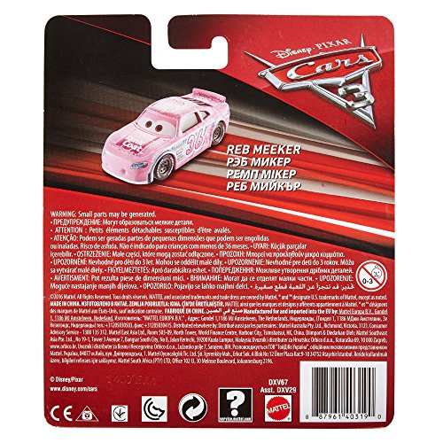 -. Binding : Toy -. Brand : Disney -. EAN : 0887961403190 -. Feature : Enchanting die-cast collection gives kids the chance to reconnect with their favorite Disney/Pixar Cars characters / Vehicles are 1:55 scale die-cast / From grills to wheels, these little vehicles are authentically styled for realistic fun / Have a blast recreating fun racing scenes from all of the films / Collect them all! each sold separately -. IsAdultProduct : 0 -. Label : Mattel -. Manufacturer : Mattel -. Model : DXV67 -. MPN : DXV67 -. PackageQuantity : 1 -. PartNumber : DXV67 -. ProductGroup : Toy -. ProductTypeName : TOYS_AND_GAMES -. Publisher : Mattel -. Studio : Mattel -. Title : Disney/Pixar Cars 3 Reb Meeker (Tank Coat) Die-Cast Vehicle -. UPC : 887961403190 -. Warranty : 1 year warranty against manufacturer defects