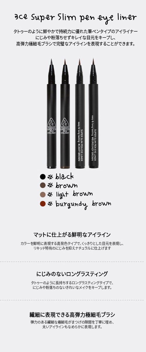 【韓国直送】韓国コスメ 3CE SUPER SLIM PEN EYE LINER (スーパー スリム ペン アイライナー/全4色1択)