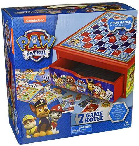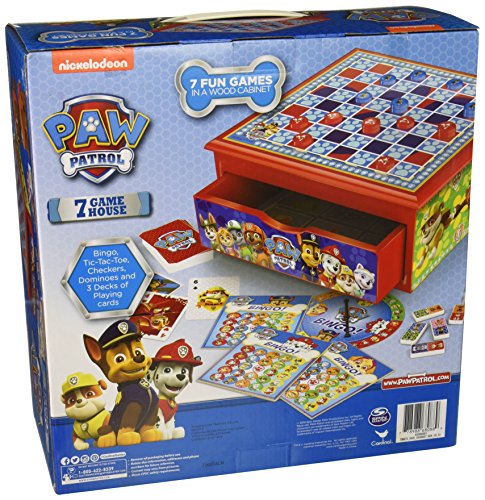 Studio : Cardinal Industries Publisher : Cardinal Industries Binding : Toy Product Description Paw Patrol Wooden Game House ? A great collection of family favorite Paw Patrol games. The sturdy?wood?box holds 7 games and all the game pieces. Family favorite games such as checkers, dominoes, bingo, tic-tac-toe, 3 decks of playing cards. 0