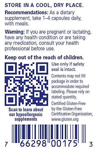 FREE FROM: Pure Encapsulations products are free from wheat, gluten, egg, peanuts, magnesium stearate, hydrogenated fat, artificial sweeteners and colors, and other unnecessary excipients. Any product containing ingredients derived from allergens, such as soy, dairy or shellfish is clearly labeled. * These statements have not been evaluated by the Food and Drug Administration. This product is not intended to diagnose, treat, cure, or prevent any disease.