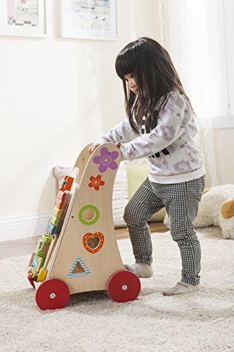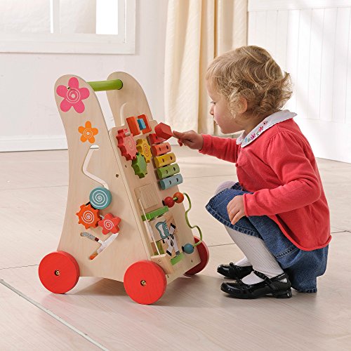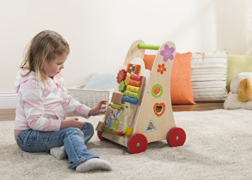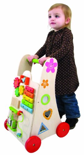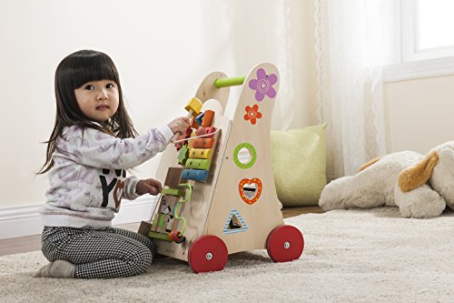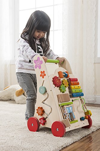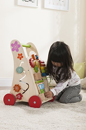 - Feature : Made of sturdy durable wood / Brightly colored and painted with water based, non-toxic and kid safe paint / Three beaded wire maze, xylophone with mallet , 4 piece interchangeable animal puzzle, shape sorter, peg maze, tumbling flower gears / There is an elastic netted storage area in the bag to cart around any of your child's other favorite toys - even a stuffed animal / Please install the bolt into the wheel as shown on the box
