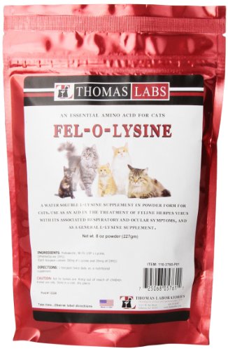 -. Binding : Misc. -. Brand : Thomas Lab -. Department : Vitamins & Supplements,Internal Medications -. EAN : 0725068057611 -. Feature : Safe and Natural / For animals whose eyes constantly water and stain the area around the eyes / Works by addressing the problem from the inside out / Contains 300mg of L-Lysine and 20mg of DMG per teaspoon. / Supports immune system function, collagen formation, tissue repair, antioxidant activity and antibody lymphocyte production. / Highly palatable immune support for cats. -. Label : THOMAS LAB -. Manufacturer : THOMAS LAB -. Model : 110-3760.P01 -. MPN : 110-3760.P01 -. PackageQuantity : 1 -. PartNumber : 110-3760.P01 -. ProductGroup : Pet Products -. ProductTypeName : PET_SUPPLIES -. Publisher : THOMAS LAB -. Studio : THOMAS LAB -. Title : Fel-O-Lysine 8 oz. Powder -. UPC : 725068057611