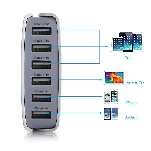 Maximizes output power upto 50W / 10amps among 6 ports, charges your multiple devices at fully speed: 2 x 2.4A, 2 x 2.1A, 2 x 1A.