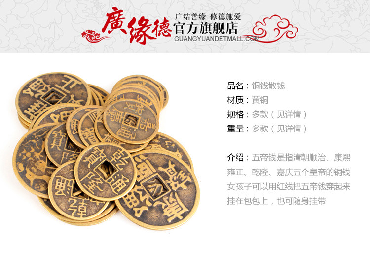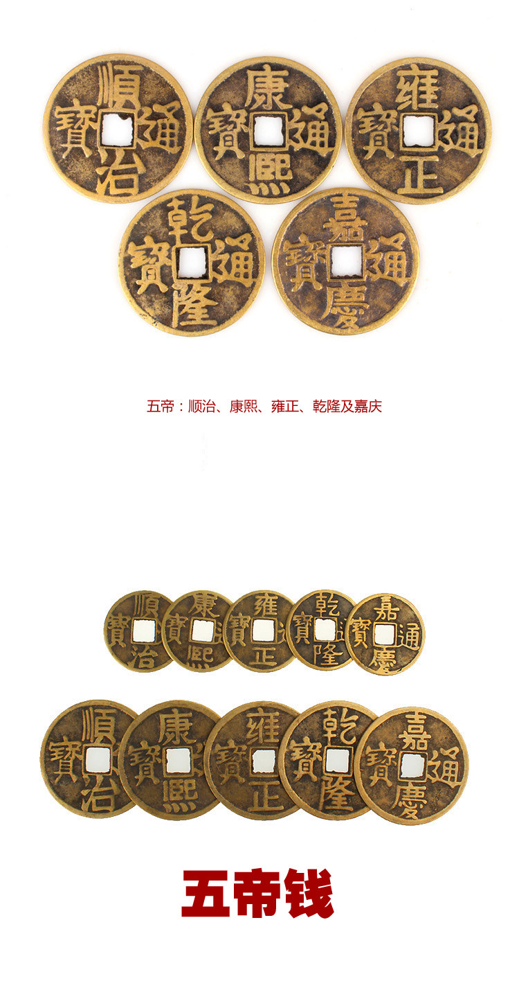 五帝钱是指清朝顺治、康熙、雍正、乾隆、嘉庆五个皇帝的铜钱。女孩子可以用红线把五帝钱穿起来挂在包包上,也可以随身挂带